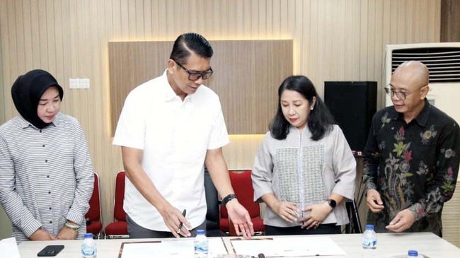 Senior Director & General Manager Herbalife Indonesia, Andam Dewi, Deputi Bidang Pembudayaan Olahraga Kementerian Pemuda dan Olahraga Republik Indonesia (Kemenpora RI), Rudy Sufahriadi, didampingi oleh Director of Government Affairs Herbalife Indonesia, Arif Mustolih, Asisten Deputi Olahraga Masyarakat Kemenpora RI, Suryati, dan Sekretaris Deputi Bidang Pembudayaan Olahraga, Suyadi Prawiro saat penandatanganan kemitraan untuk mencapai target nasional - Indonesia Sehat & Bugar - pada tahun 2045 di Kantor Kementerian Pemuda dan Olahraga Indonesia, Senayan, Jakarta.