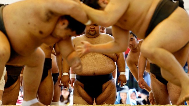 Aksi Pegulat Sumo di Turnamen Honozumo Jepang