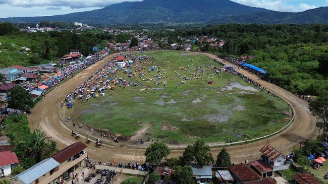 Foto udara sejumlah joki memacu kudanya dalam lomba Pacu Kuda Wali Kota Bukittinggi Cup di Gelanggang Bukit Ambacang Bukittinggi, Sumatera Barat, Sabtu (6/7/2024).
