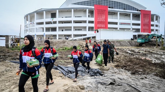 Sejumlah pemain voli PON XXI Aceh-Sumut melewati jalan berlumpur di GOR Bola Voli Indoor Sumut Sport Center, Kabupaten Deli Serdang, Sumatera Utara, Selasa (10/9/2024).