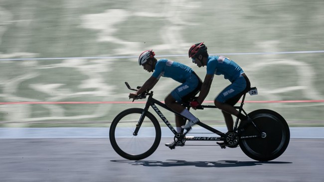 Atlet balap sepeda Jawa Tengah Eka Varianto (kanan) memacu sepedanya pada nomor individual pursuit MB putra para balap sepeda Peparnas XVII 2024 di Velodrome, Manahan, Solo, Jawa Tengah, Senin (7/10/2024). Eka Varianto finis diperingkat kedua dengan catatan waktu 5 menit 1 detik. ANTARA FOTO/Mohammad Ayudha.