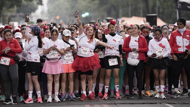 Meksiko - Meksiko kembali menggelar Fun Run Hello Kitty. Para peserta, yang didominasi perempuan, mengenakan beragam aksesoris bertema Hello Kitty.