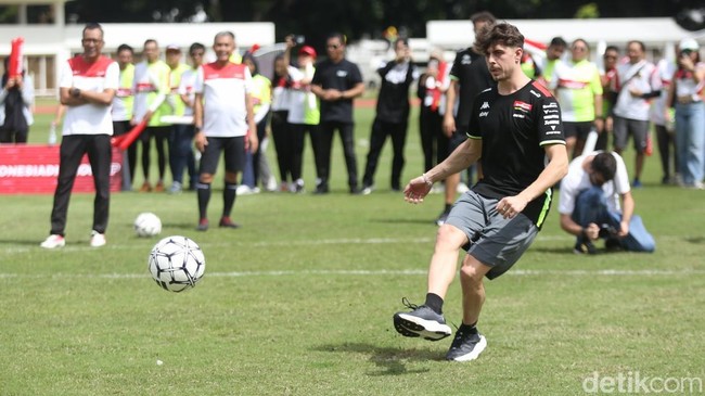 Jakarta - Dua pembalap MotoGP dari tim Pertamina Enduro VR46, Fabio Di Giannantonio dan Franco Morbidelli adu skill dengan Rizky Ridho dan kawan-kawan. Yuk lihat.