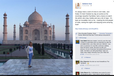 Petenis berambut coklat itu mengunjungi Taj Mahal dengan busana santai. Dia mengenakan blus bercorak hitam putih. Rambutnya diikat ala ekor kuda. Kacamata hitam melengkapi penampilan dia.