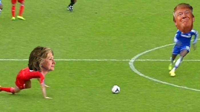 Selain itu ada pula meme yang memperlihatkan Trump sebagai eksekutor tendangan penalti dalam aksinya bikin gol ke dalam gawang lawan, tentu sebagai Hillary jadi kiper.