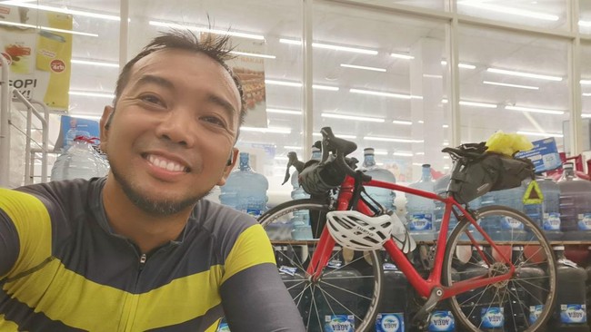 Dalam perjalanannya, Ario sempat singgah dulu di Tegal, untuk mengistirahatkan kaki setelah mengayuh lebih dari 300 km.