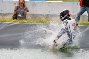 Tepat di bibir sebuah kolam yang terletak di tengah sirkuit, dia melompat bebas ke dalamnya. Masih menggunakan helm dan baju balap lengkap, pembalap Spanyol itu terlihat asyik berenang di kolam tersebut.
