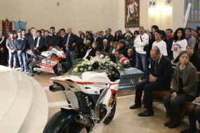 Di dalam gereja, di atas peti mati tempat Simoncelli berbaring diletakkan helm milik pembalap yang tewas di GP Malaysia akhir pekan lalu itu. Sementara di bagian kiri dan kanan peti diletakkan dua tunggangannya yakni motor 250cc Gilera dan Honda RC212V.