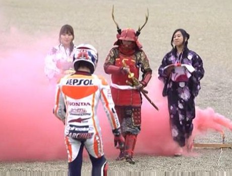 Yang paling menarik dari rangkaian perayaan tersebut adalah saat Marquez seakan-akan dinobatkan menjadi seorang samurai. Itu terjadi tak lama setelah dia menyentuh garis finis.