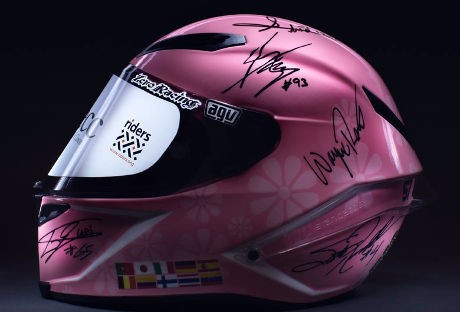 Helm tersebut adalah yang dilelang dan ditandatangani oleh 12 bintang masa lalu dan masa kini MotoGP, yaitu Giacomo Agostini, Angel Nieto, Valentino Rossi, Jorge Lorenzo, Marc Marquez, Dani Pedrosa, Wayne Rainey, Loris Capirossi, รlex Criville, Wayne Gardner, Scott Russell dan Randy Mamola.