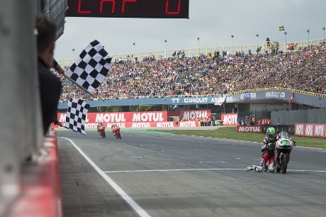 Dalam posisi tidak duduk di atas motor, Ajo masih bisa menjaga motornya tetap berdiri - meski arah lajunya sudah keluar dari lintasan. Entah bagaimana, rider asal Finlandia itu masih bisa mengendalikan tunggangannya. Sambil terseret di sisi motor dia mengarahkan motor kembali ke lintasan dan menyentuh garis finis. Semua dia lakukan dalam posisi tidak duduk di atas motor.
