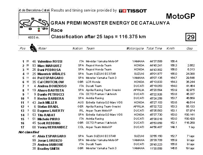 Pada balapan yang dihelat di sirkuit Catalunya, Montmelo, Minggu (5/6/2016) malam WIB, Rossi yang start di posisi kelima justru mampu mengakhiri balapan di posisi terdepan. Pertama-tama dia lewati Lorenzo dan terlibat duel sengit dengan Marquez sebelum merebut kemenangan keduanya musim ini.