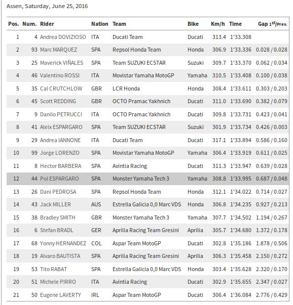 Rider Honda, Marc Marquez, ada di posisi kedua dengan catatan waktu 0,028 detik lebih lambat dari Dovizioso. Peringkat tiga ditempati oleh Maverick Vinales yang mencatatkan waktu satu menit 33,370 detik.