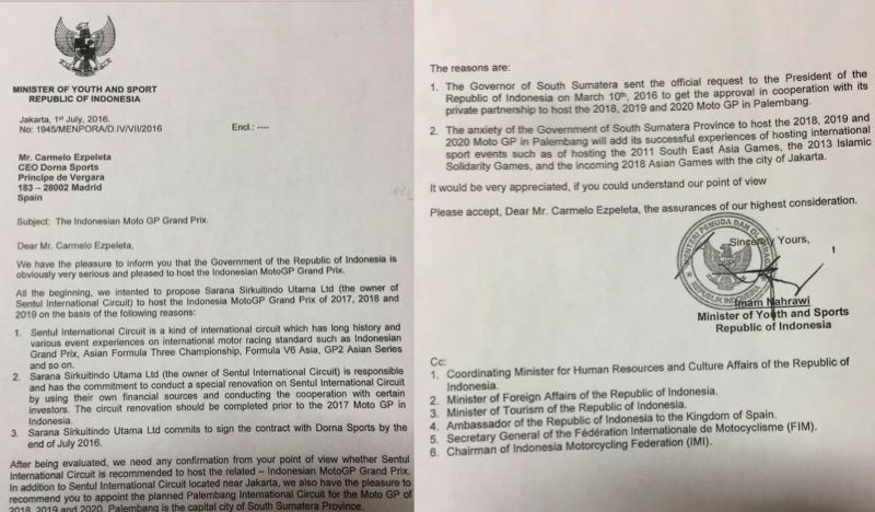 Pada kesempatan yang sama juga beredar surat Kemenpora kepada Dorna -- dalam bahasa Inggris --, yang mempertanyakan kelayakan Sentul, sekaligus menyodorkan Palembang sebagai opsi lain venue MotoGP Indonesia untuk musim 2018 dan 2019.
