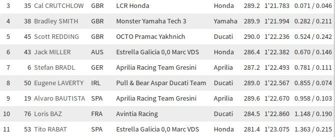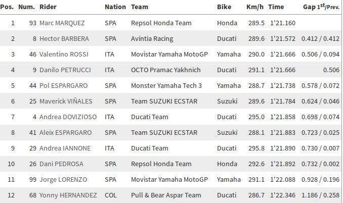 Catatan waktu Marquez unggul 0,412 detik atas Barbera yang berada di posisi kedua. Sementara itu, Rossi berada di posisi ketiga dengan catatan waktu 1:21,666 detik.