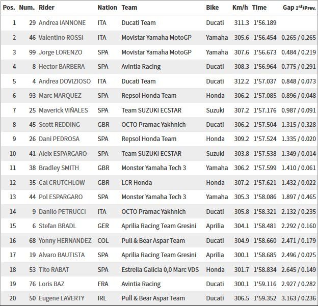 Rekan setim Iannone, Andrea Dovizioso harus puas di posisi kelima di belakang Hector Barbera. Sedangkan duo Repsol Honda belum mendapatkan hasil optimal setelah Marc Marquez hanya berada di peringkat keenam dan Dani Pedrosa kesembilan, di belakang Scott Redding [8], dan rider Suzuki Ecstar Maverick Vinales [7].