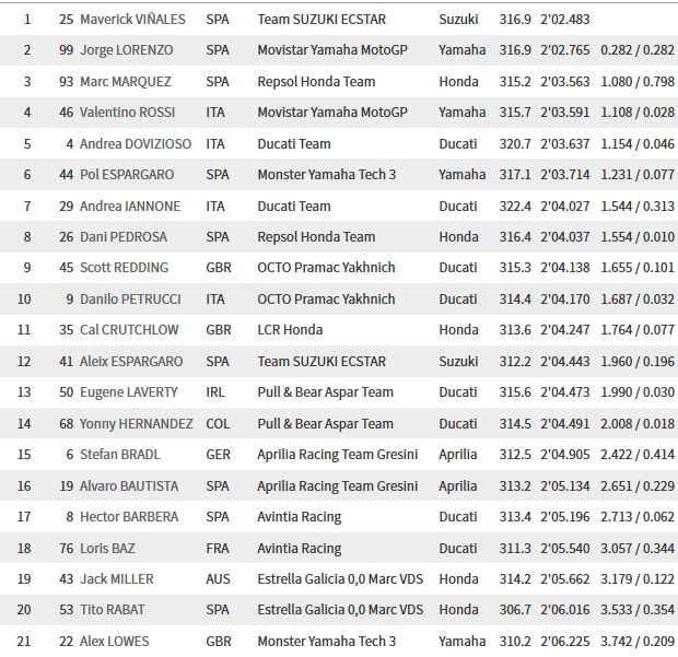 Rekan setim Dovizioso, Andrea Iannone, harus puas berada di posisi ketujuh. Pebalap Italia ini di antara Pol Espargaro dan Dani Pedrosa. Sementara Scott Redding finis di peringkat kesembilan, di depan Danilo Petrucci.