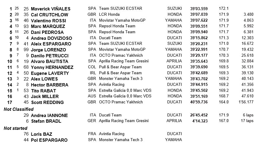 Dengan hasil ini, Vinales menempati posisi keempat klasemen sementara dengan 125 poin. Posisi teratas masih dimiliki Marquez, yang finis keempat, dengan 210 poin unggul 50 poin dari Rossi dan 64 poin dari Jorge Lorenzo.