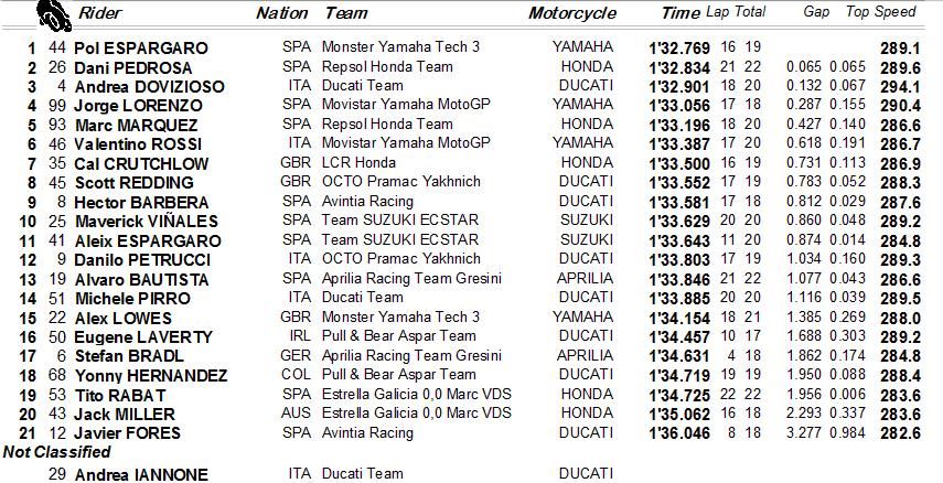 Dovizioso menempati posisi ketiga setelah membukukan waktu 1 menit 32,901 detik. Di belakangnya ada Jorge Lorenzo dan Marc Marquez.