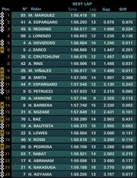 Pesaing terdekat Marquez adalah pebalap Aprilia, Aleix Espargaro. Tapi, catatan waktu Espargaro berselisih 0,875 detik dari milik Marquez.
