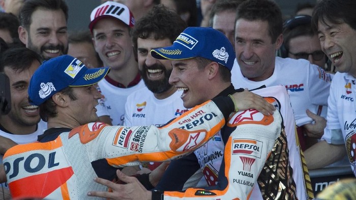 Pedrosa tepat berada di belakang Marquez saat balapan di sirkuit Ricardo Tormo, Minggu (12/11/2017) malam WIB sudah melalui 23 putaran. Di saat itu pula, Marquez melakukan manuver berani untuk mengambil alih posisi terdepan dari Johann Zarco.