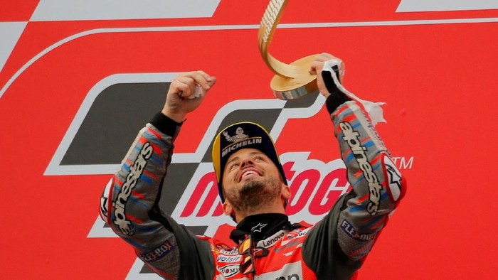 Andrea Dovizioso memenangi MotoGP Valencia di Sirkuit Ricardo Tormo, Minggu (18/11/2018) malam WIB. Rider Ducati itu finis di depan Alex Rins dan Pol Espargaro dalam balapan yang berlangsung kacau karena guyuran hujan lebat.