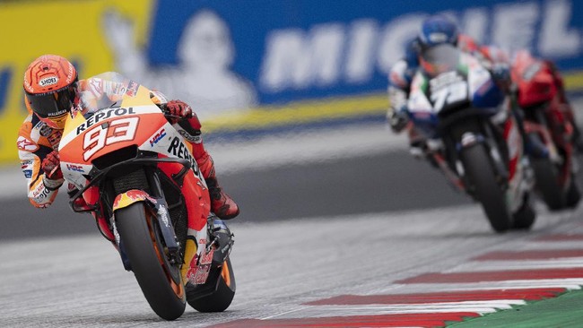 Marc Marquez memulai balapan MotoGP Styria di Red Bull Ring, Minggu (8/8/2021) malam WIB dari posisi delapan. Ia lantas merangsek ke depan dan sempat merebut posisi tiga, sebelum akhirnya disalip Fabio Quartararo dan Joan Mir.