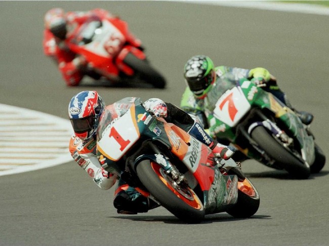 Honda mendominasi balapan MotoGP Indonesia 25 tahun lalu. Alex Criville, rider Repsol Honda lainnya, finis ketiga.