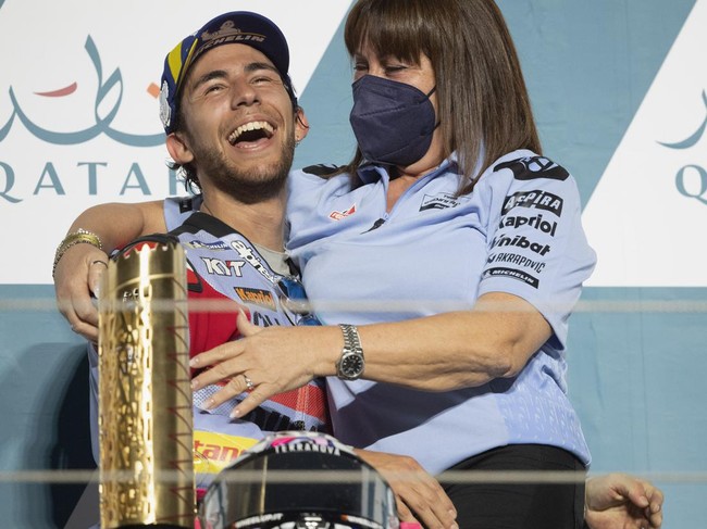 Saat di podium, Bastianini mengajak istri mendiang Fausto untuk merayakan kemenangan. Momen itu sangat spesial untuk seluruh anggota tim Gresini.