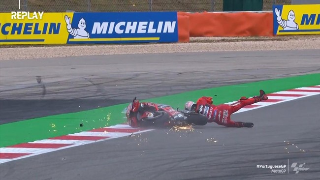 Namun malang tak dapat ditolak, Bagnaia yang menggunakan ban slick justru mengalami crash di tikungan pertama. Motornya mengalami highside, dan ia terjatuh dengan lengan kanan membentur trek.