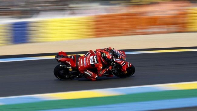 Bagnaia mengalami nasib nahas pada balapan di Sirkuit Le Mans, Minggu (14/5/2023) malam WIB. Rider Ducati itu kehilangan posisi terdepan setelah start kemudian out usai bertabrakan dengan Maverick Vinales di putaran kelima.