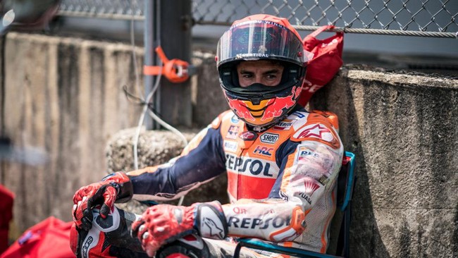 Tak seperti saat crash di sesi kualifikasi, Marquez tak buru-buru kembali ke paddock usai crash di sesi warm-up. Dia terlihat terpincang-pincang.