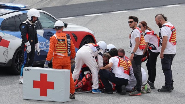 Bagnaia mengalami highside di Turn 2 dan terjatuh di dalam lintasan. Kakinya terlindas Brad Binder dan tak bisa melanjutkan balapan.