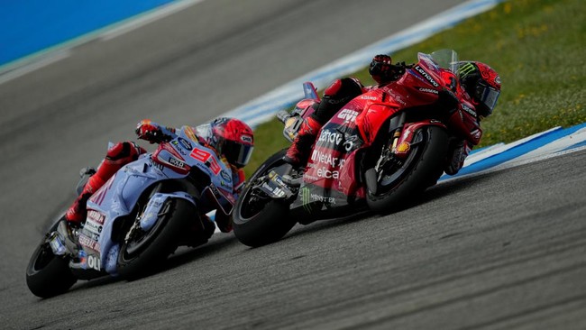 Setelah Jorge Martin jatuh, kedua penunggang Ducati itu terlibat duel menegangkan di fase akhir balapan di Sirkuit Jerez pada Minggu (28/4). Marquez pelan-pelan memangkas jarak 1,2 detik sehingga berada dalam jangkauan untuk melakukan serangan terhadap juara dunia MotoGP back to back itu.
