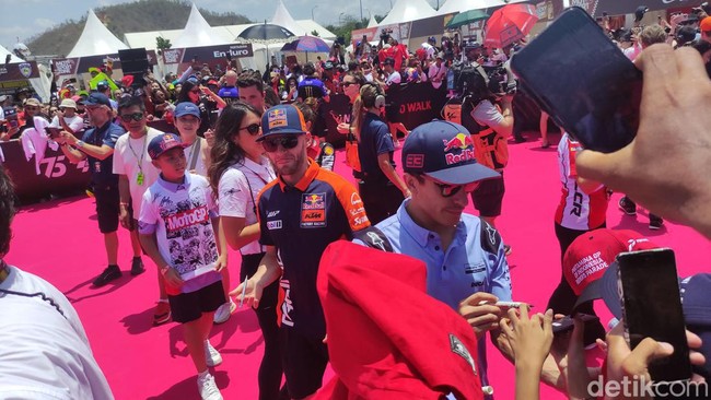 Para rider MotoGP Mandalika 2024 dibawa bertemu para penggemar sebelum memacu motor lintasan. Jadi kesempatan fans meminta tanda tangan ke idola mereka.
