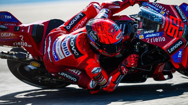Pecco Bagnaia menyalip Alex Marquez di Turn 12 lap keempat untuk merebut P2. FB63 berjarak 1,5 detik dari Marc Marquez di depannya.
