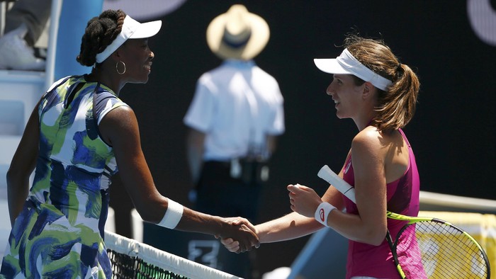 Dalam pertandingan di Rod Laver Arena, Selasa (19/1), Venus kalah dua set langsung 4-6, 2-6 dari Konta dalam tempo satu jam 19 menit.