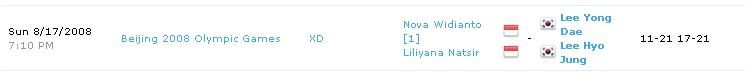 Medali perak Olimpiade ketika itu diraih Nova/Liliyana saat kalah 11-21, 17-21 atas pasangan Korea Selatan Lee Yong Dae/Lee Hyo Jung. Yang menarik adalah, partai itu dihelat di Beijing pada tanggal 17 Agustus 2008. Juga saat perayaan kemerdekaan RI.