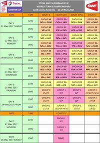 Indonesia tergabung dalam Grup D bersama Denmark, yang menjadi unggulan kedua, dan tim nonunggulan India dalam kejuaraan bulutangkis beregu campuran di Gold Coast pada 21 2-18 Mei 2017 itu. Pasukan Merah Putih akan berjumpa dengan Denmark lebih dahulu, pada Senin (22/5/2017) dan dilanjutkan versus India, Selasa (23/5/2017).