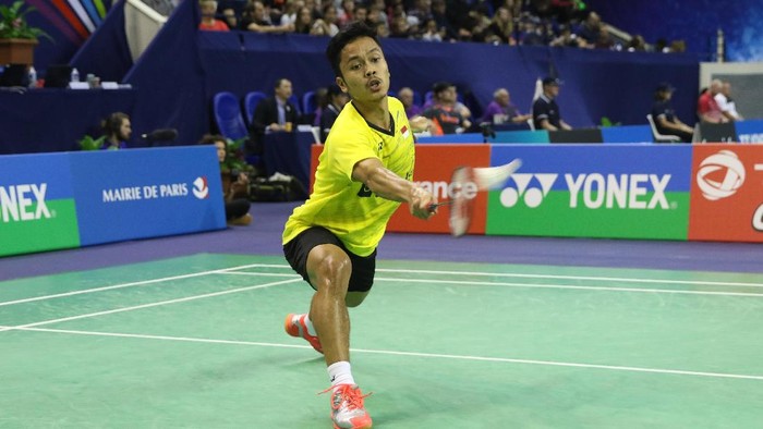 Anthony lolos setelah menyingkirkan pemain India, Kashyap Parupalli, pada pertandingan babak pertama di Stade Pierre de Coubertin, Paris, Rabu (25/10/2017). Anthony harus bertanding rubber game sebelum menang 21-23, 21-18, 21-17.