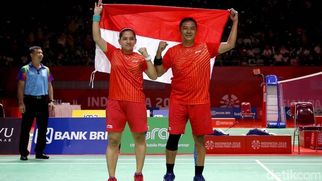Ganda campuran bulutangkis Indonesia, Hary Susanto/Leani Ratri Oktila, menyumbang medali emas di ajang Paralimpiade Tokyo 2020. Mereka mengalahkan Lucaz Mazur/Faustine Noel.