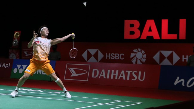 Kento Momota menang straight game atas Tommy Sugiarto dalam pertandingan babak pertama Indonesia Masters 2021, Selasa (16/11/2021). Partai yang berlangsung di Bali International Convention Center, Nusa Dua, tersebut tuntas 21-12 dan 21-16 dalam waktu 44 menit.