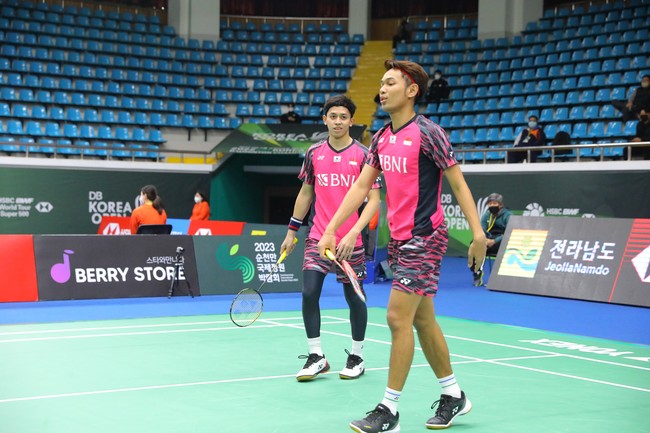 Laga tersebut berlangsung di Palma Stadium, Suncheon, Korea, Jumat (8/4/2022) sore WIB. Fajar/Rian menang dua gim langsung dengan skor ketat, 21-19 dan 22-20.