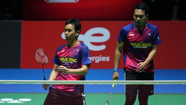 Mohammad Ahsan/Hendra Setiawan kalah Liu Yu Chen/Ou Xuan Yi 13-21,18-21. Ahsan/Hendra tak mampu jadi juara Grup B di BWF World Tour Finals 2022.