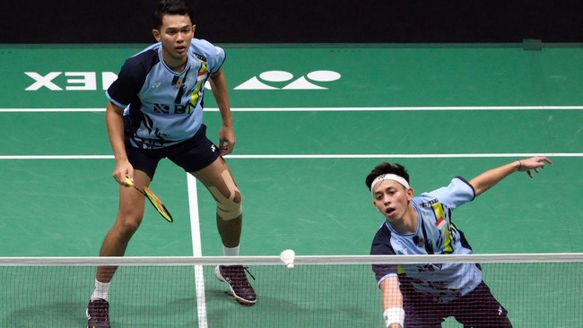 Bola menyilang Rian memastikan dia dan Fajar menang 21-13. Fajar/Rian mengunci tiket ke semifinal India Open 2023.