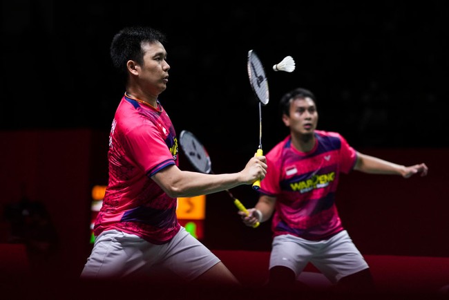 24-24 Smash keran Ahsan menukik tajam ke tengah, masuk. Hendra selanjutnya gagal kembalikan bola, 25-24 untuk Liang/Wang.