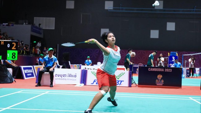 Bertanding di Morodok Techo National Stadium Badminton Hall, Rabu (10/5/2023), Komang Ayu Cahya Dewi membuka kemenangan Indonesia usai mengalahkan Mikaela Joy De Guzman dengan skor 21-13, 21-5 dalam waktu 26 menit.