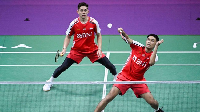 Fajar Alfian/Muhammad Rian Ardianto menghadapi ganda Denmark Jeppe Bay/Lasse Molhede, pada babak pertama Indonesia Open 2023 di Istora Senayan, Selasa (13/6/2023) sore WIB. Mereka menang 21-15 dan 21-11 dalam waktu 35 menit.