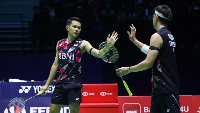 Fajar/Rian ditantang Akira Koga/Taichi Saito di babak kedua All England 2024. Bertanding di Utilita Arena, Birmingham, Jumat (15/3/2024) dini hari WIB, Fajar/Rian yang sempat kehilangan gim pertama akhirnya menang 18-21, 21-17, 21-18.