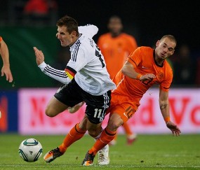 Foto: Wesley Sneijder (Belanda) melakukan tekel terhadap Miroslav Klose (Jerman) pada sebuah laga ujicoba. Jerman menang 3-0 pada laga yang berlangsung beberapa waktu lalu tersebut. (Getty Images)
